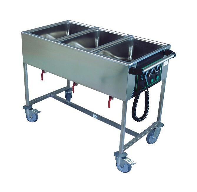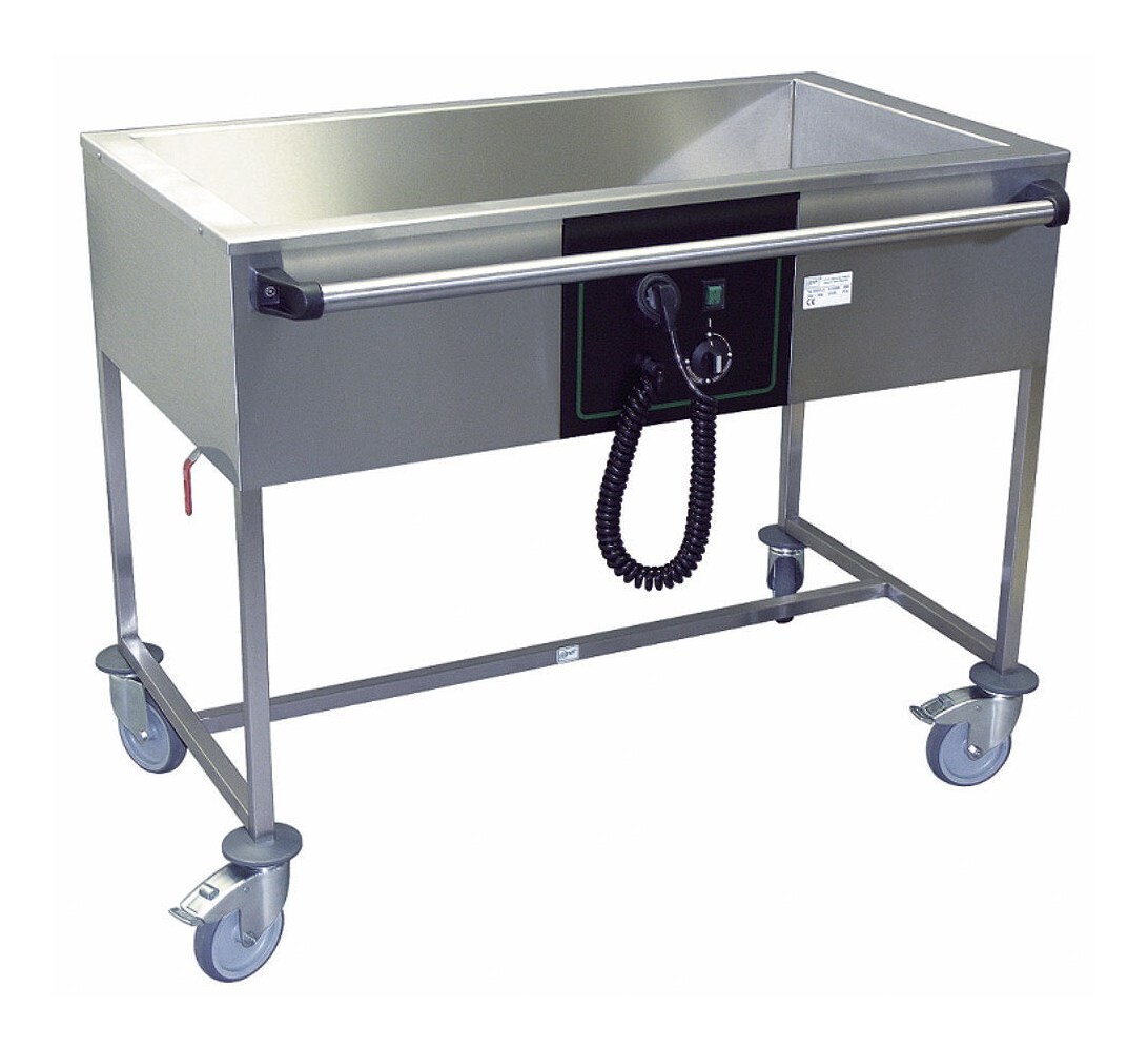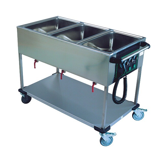 Jídelní výdejní vozíky a pulty EKG jsou určeny k přihřívání a výdeji jídel z gastronádob (GN). Konstrukce vozíku je vyrobena z chromniklové oceli 18/10. Vozíky ve standardním provedení jsou dodávány se 4 otočnými kolečky Ø 125 mm, z toho 2 s brzdou. Jednotlivé vany jsou určeny pro výdej z gastronádob 1/1 gastronormy, popř. menších. Hloubka gastronádob může být až 200 mm. Každá vana má samostatné vyhřívání topným tělesem a regulaci teploty lázně až do 90 °C. Elektropřívod vozíku je 230 V / 50 Hz. Přívod zajištěn točeným el. kabelem, jehož délka je v nataženém stavu 200 cm.